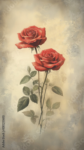 two elegant red roses against soft background for romantic occasions, Retro-style Valentine’s card