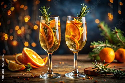 Two elegant sparkling drink glasses adorned with fresh rosemary sprigs and vibrant orange peels resting on a