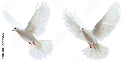 Two elegant white doves in flight, symbolizing peace and freedom against a transparent background.