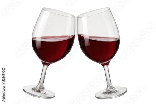 Two elegant wine glasses filled with red wine are touching, creating a celebratory mood against a transparent background