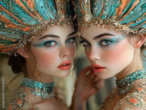 Two elegantly adorned models with intricate headpieces pose closely together, showcasing vibrant costumes and makeup, set against a softly blurred background