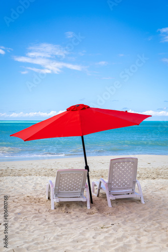 Two empty beach chairs and an umbrella on a beautiful day in the Caribbean