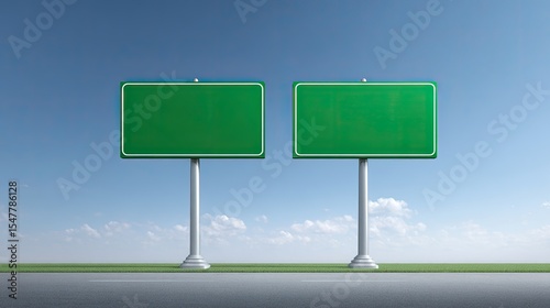 Two Empty Green Billboards on Roadside Under Bright Blue Sky