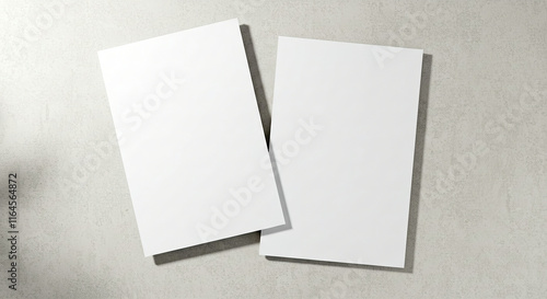 Two empty white rectangle poster mockups lying diagonally on top of each other with soft shadows on neutral light grey concrete background. Flat lay, top view