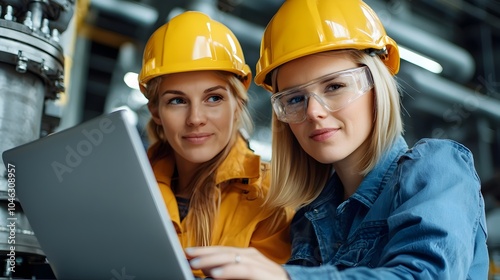 Two engineers collaborating on a laptop to inspect and monitor the relay protection system in a large scale manufacturing plant ensuring efficient and safe industrial