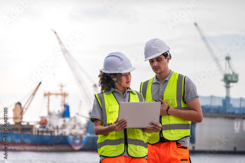 Two engineers wearing safety vests and helmets inspect port operations near the waterfront. They use a laptop and walkie-talkie, symbolizing teamwork, logistics, and marine industry work.