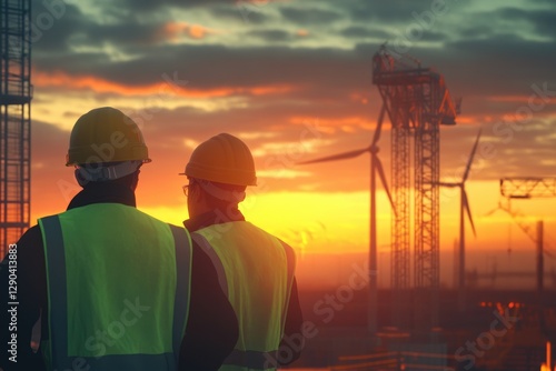 Two engineers wearing yellow safety helmets and green reflective vests, discussing a wind power plant construction site in the sunset light. Wind turbines dot the horizon.