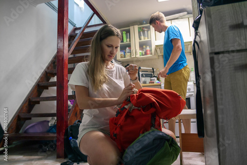 Two enthusiastic travelers are organizing their gear for an exciting outdoor journey in a cozy indoor setting