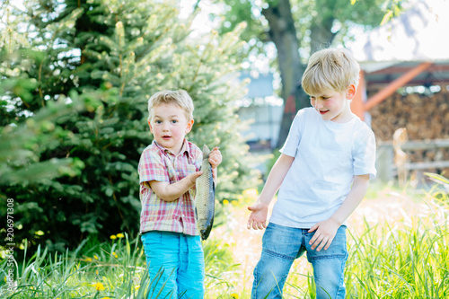 Two excited blond brothers little fishmen enjoying the catch in sunny summer day outdoor. Childhood and adventure concept.