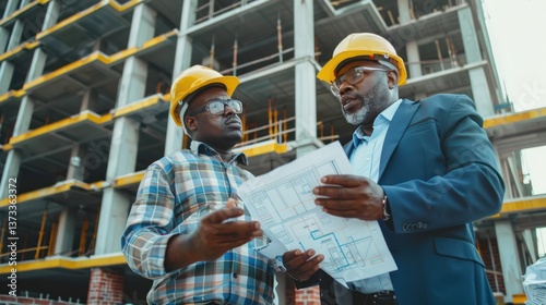 Two executives discussing construction timelines and budgets.