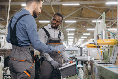 Two factory workers operating industrial machinery producing aluminum and PVC windows and doors