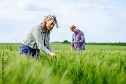 Two farmers standing in wheat field examining crop yield.