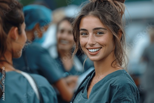 Two female nurses laughing and talking in a busy hospital, showcasing teamwork and positivity