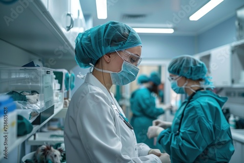 Two female surgeons in scrubs perform a medical procedure in a hospital room