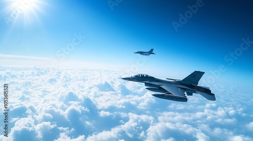 Two fighter jets flying in formation over the clouds.