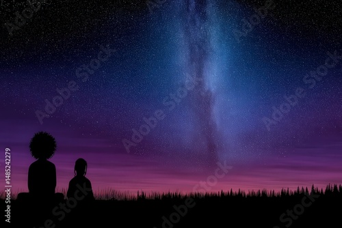 Two figures gazing at a breathtaking night sky filled with stars and a vibrant galaxy creating an atmosphere of wonder and connection to the universe in a serene natural landscape