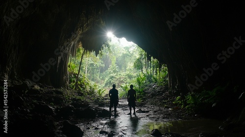 Two figures stand in a dark cave, sunlight streaming through the entrance to a lush jungle