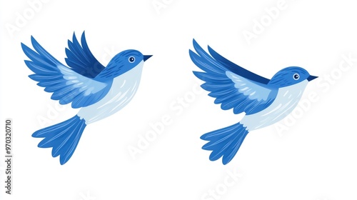 Two flat style blue winged bird icons isolated on a white background representing flight