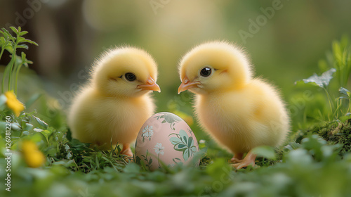 Two fluffy baby chicks curiously investigate a beautifully decorated egg surrounded by greenery and wildflowers, symbolizing the joy of Easter in a tranquil garden