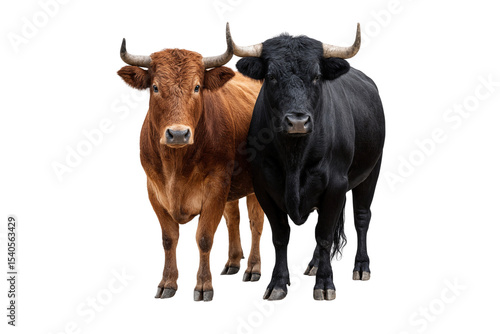 Two formidable bulls, one brown and one black, standing side by side, isolated on transparent background