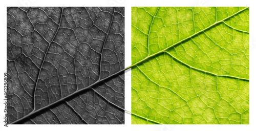 Two fragments of one leaf. Withered leaf and green. Ecology, environmental protection. Concept