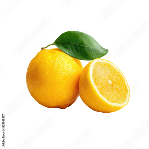 Two fresh citrus fruits, one whole orange and a halved lemon, with a leaf