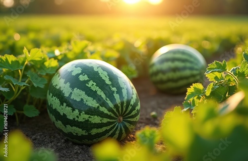 Two fresh organic watermelons grow in field during morning sunlight. Close-up view shows striped green rinds, foliage in foreground. Healthy fruit cultivation represents natural farming, ripe harvest