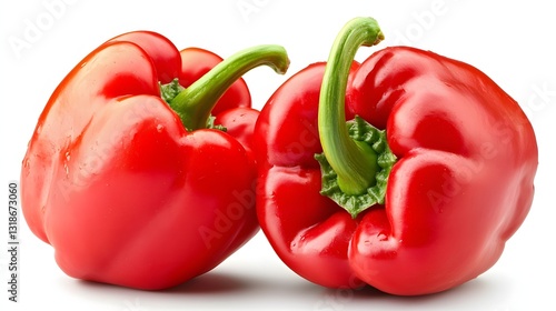 Two Fresh Red Bell Peppers with Glossy Skin and Vibrant Green Stems on White Background