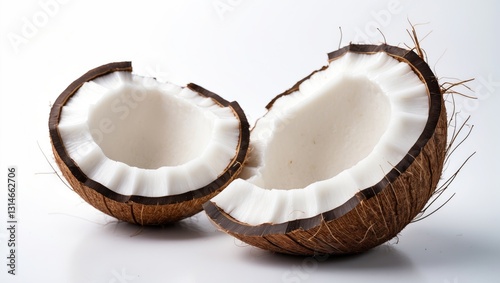 Two fresh ripe coconut halves set against a white background