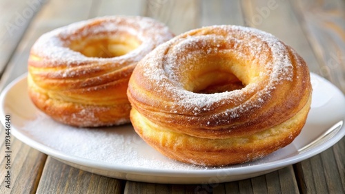 Two freshly baked donuts dusted with powdered sugar, resting on a white plate, capturing a sweet and tempting moment