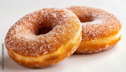 Two freshly baked, golden brown donuts dusted with sugar, shot on a white background.