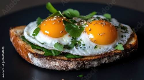 Two fried eggs atop toasted bread with greens