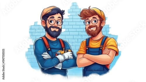 Two Friendly Cartoon Builders Smiling with Tools Against a Light Brick Wall Background in Vibrant Colors