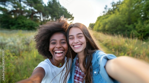 Two friends smiling joyfully while taking a selfie outdoors, surrounded by lush greenery and a bright, sunny atmosphere.