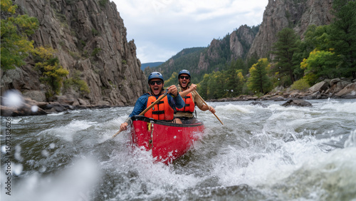 Two friends wearing helmets and life vests paddle a red canoe through roaring whitewater rapids in a rugged mountain river. Water splashes dramatically as they shout with excitement.