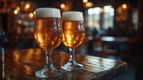 two frosty glasses of golden beer on a rustic wooden table set in a cozy pub atmosphere with warm ambient lighting and rich inviting tones