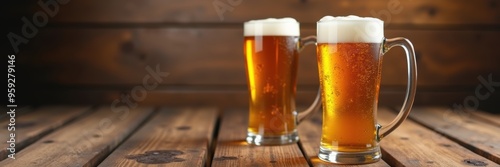 Two frosty mugs of beer on a rustic wooden table, perfect for advertisements related to breweries, pubs, or social gatherings.