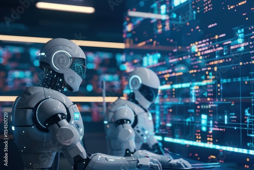 Two futuristic robots interacting with a digital interface.