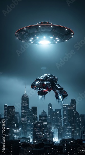 Two futuristic spacecraft hover over a city at night, illuminated by an ethereal glow.