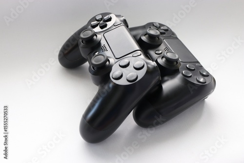 Two game joysticks close up, Modern black game controllers - ergonomic gaming accessories for console, game controllers on white background, joysticks on white background, gamepads