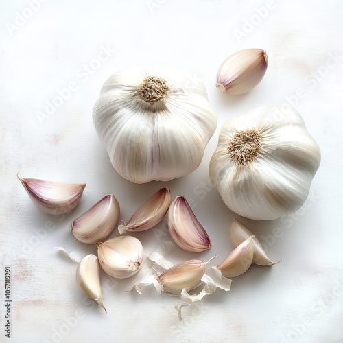 Two garlic bulbs with cloves scattered on a bright, minimal background.