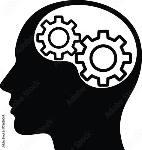 Two gears in human head silhouette symbolize thinking process in gray transparent background business solutions ideas innovation