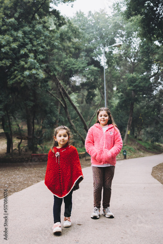 Two girls dressed in winter clothes, walking in a park road. Vertical copy space
