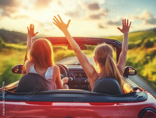 Two girls enjoy a sunny day, driving in a red convertible with their hands raised in excitement, surrounded by a lush green landscape.
