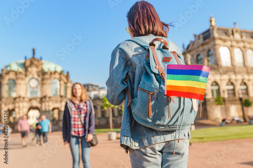 Two girls travelers having fun in Dresden with rainbow flag symbol. Free love relationship concept