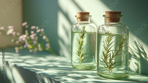 Two glass bottles of essential oil with rosemary and levitating drops on pastel green, a wellness scene.
