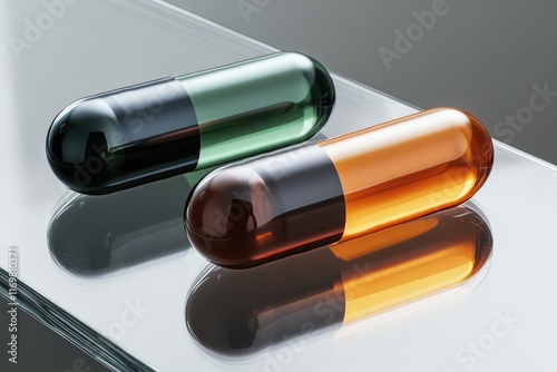 Two glass capsules, one green and black, the other amber and black, rest on a reflective surface.