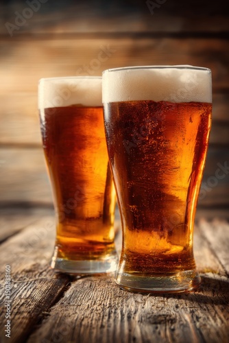 Two Glasses of Amber Beer with Frothy Head on Rustic Wooden Tabletop Close Up Still Life