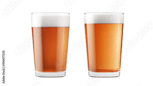 Two glasses of beer with different colors and textures, presented on a white isolated background.