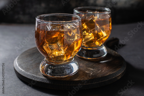 Two glasses of bourbon or rum with ice on dark background close up. Party drinks concept.